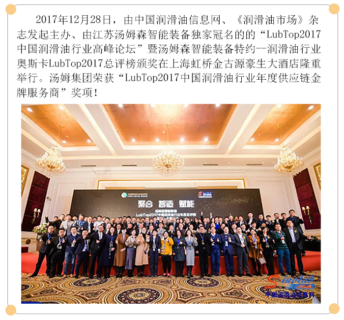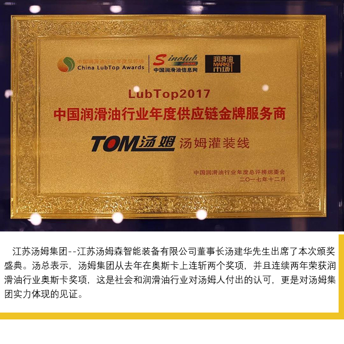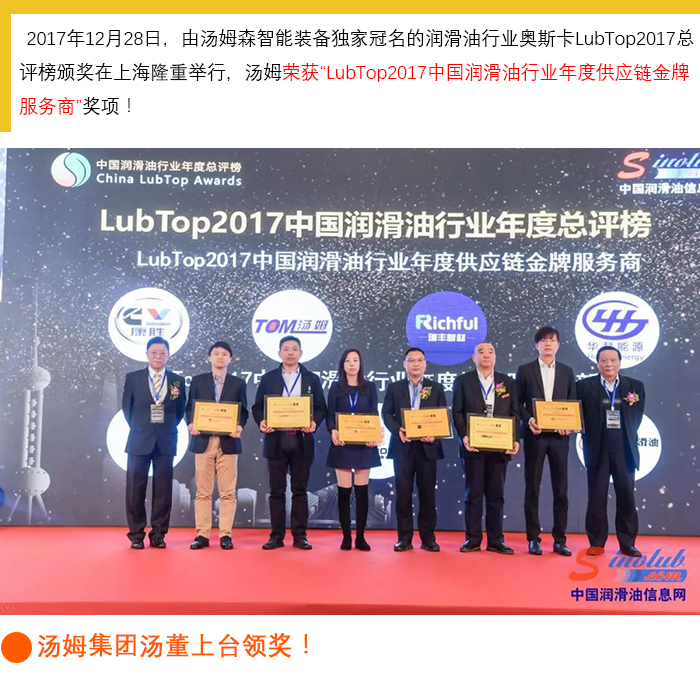 【喜訊】湯姆再次榮獲 LubTop2017中國潤滑油行業(yè)年度供應鏈金牌服務(wù)商獎!