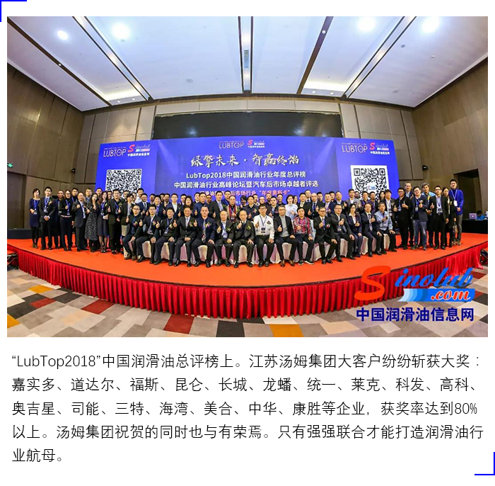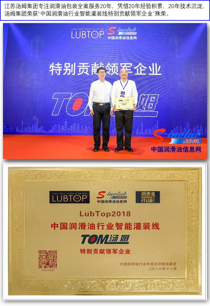 湯姆集團榮獲"LubTop2018中國潤滑油行業(yè)智能灌裝線(xiàn)特別貢獻領(lǐng)軍企業(yè)"稱(chēng)號